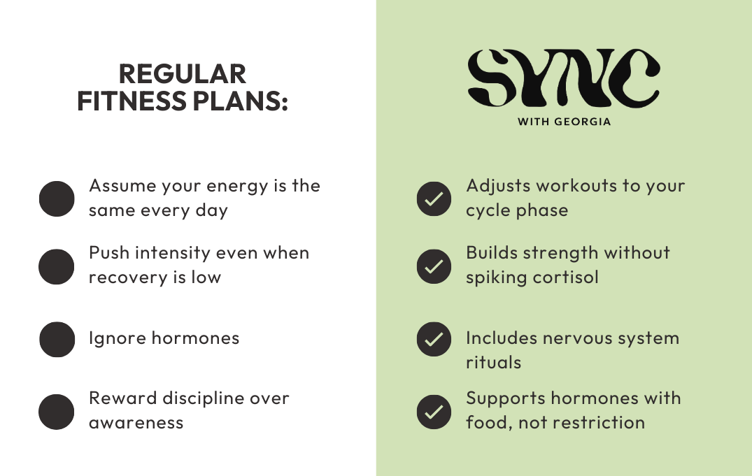 Sync with Georgia is a founder led women’s fitness app created to support hormones, stress, and sustainable strength rather than high intensity or punishment based training.