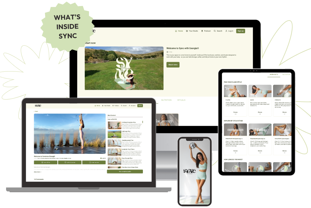 Sync with Georgia is a hormone supportive fitness app for women. The app provides Pilates based with strength training, low impact workouts, nervous system regulation movement, and nutritional guidance designed to support hormone balance, reduce stress, and improve consistency without burnout.